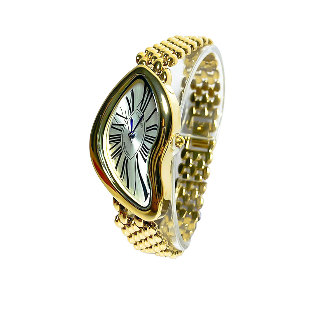 Ce modèle s'inspire de l'art surréaliste de la Cartier Crash, avec son boîtier aux formes fondues et asymétriques. Cette version dorée est une pièce audacieuse et artistique qui se porte comme un bijou, idéale pour celles qui cherchent une élégance qui sort de l'ordinaire.